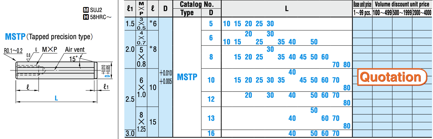 Chốt định vị MSTP là sản phẩm cơ khí chính xác đến +0.01mm, với độ chính xác cao và được xử lý nhiệt đạt độ cứng cao, thường được sử dụng lắp ghép trong khuôn mẫu hay trong máy jig đồ gá tự động hóa.