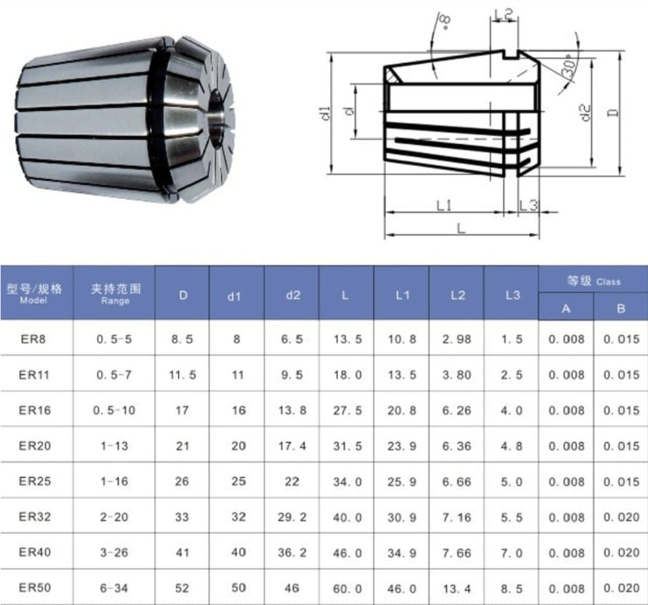 – Mỗi collet ER kẹp đúng kích thước đường kính .